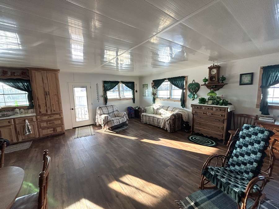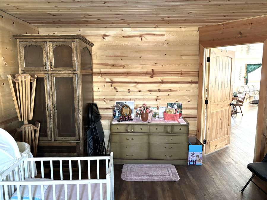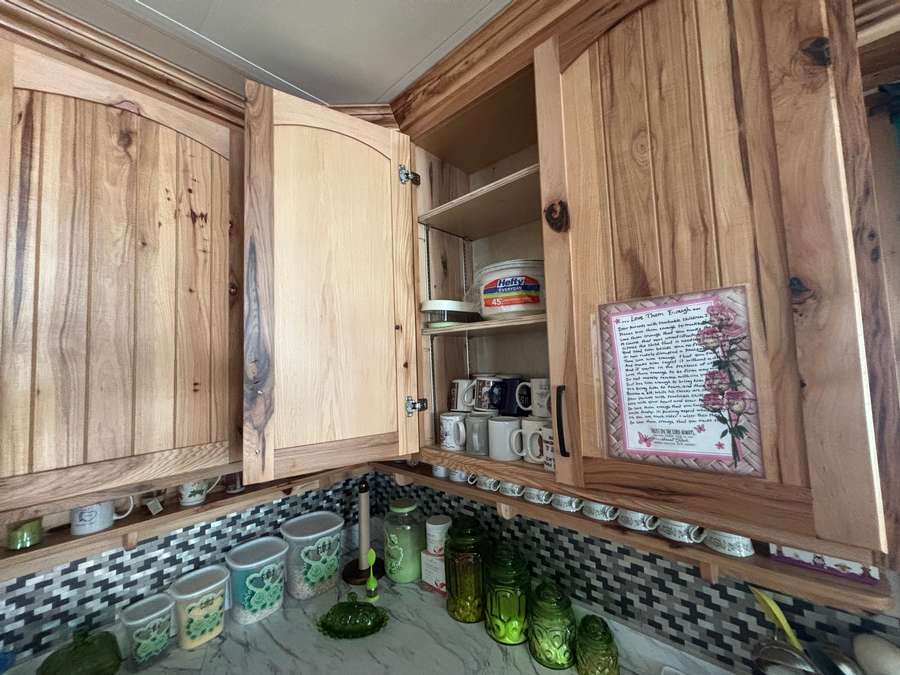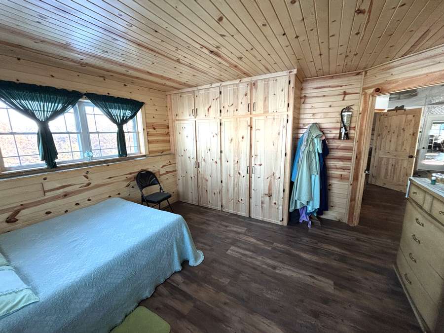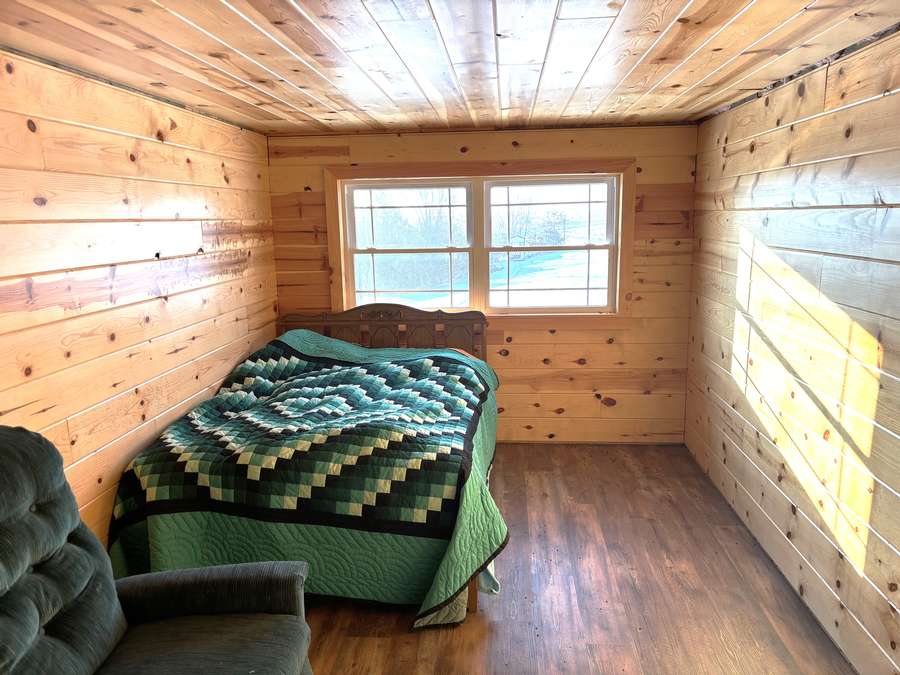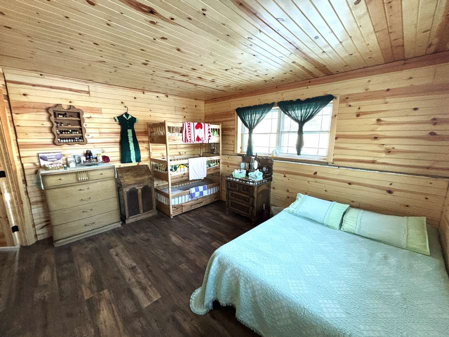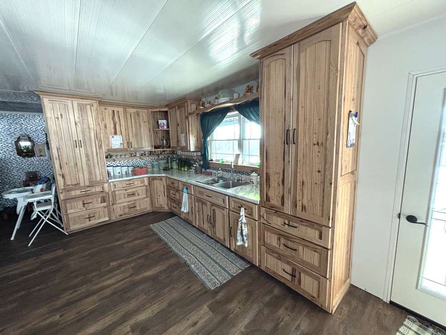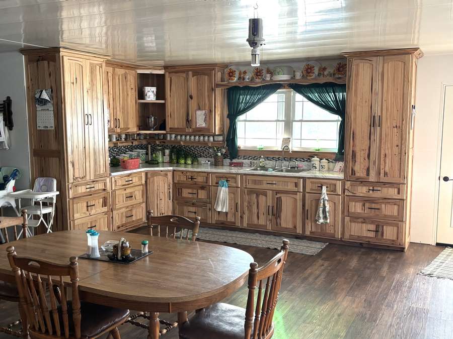 The main level (approx. 1,360 sq. ft.) features 2 bedrooms, 1 full bathroom, and an inviting open-concept layout connecting the kitchen, dining, and living areas. Beautiful hand-crafted hickory cabinets and generous windows create a warm, naturally lit interior. A covered front porch provides the perfect place to relax and enjoy peaceful rural views.