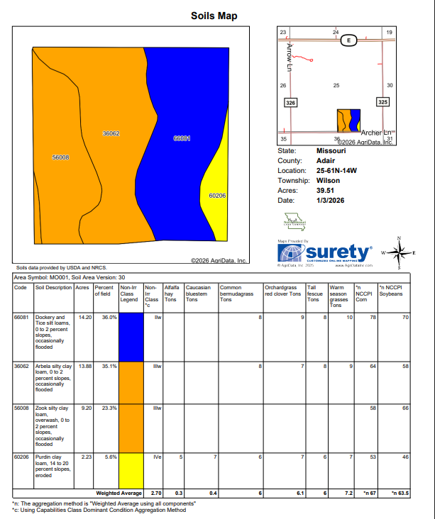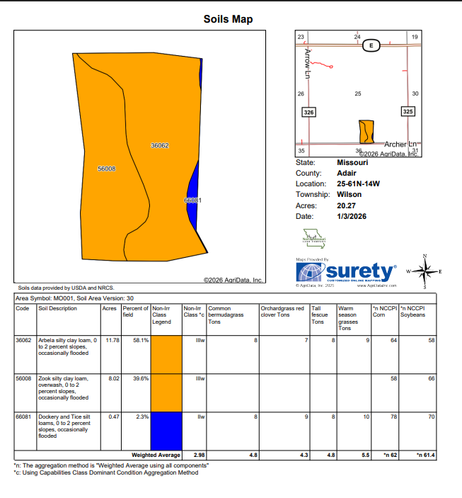 Approximately 20 acres of fertile creek-bottom ground are currently in row-crop production, providing consistent annual income. The tillable acres consist primarily of productive Arbela and Zook soil types, which are well known in the area for strong crop yields.